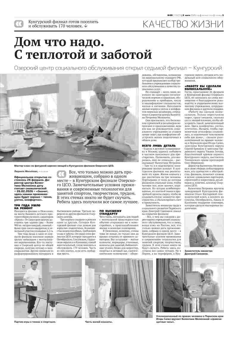 Официальное открытие состоялось вчера, 26 февраля. Директор центра Валентина Мелюхина дату считает символической – 26.02.2026. «Значит, здесь все будет хорошо – тепло, уютно, комфортно нашим проживающим». Находится филиал в Неволино, на месте бывшего детского противотуберкулезного санатория «Ирень». От санатория центру достались три здания и земельный участок. Год ушел на то, чтобы сделать проект капитального ремонта, дизайн-проект, планировку участка. Корпуса уходили в работу один за другим. Сегодня Кунгурский филиал Озерского ЦСО стал домом для 170 взрослых подопечных, большинство из них недееспособны, требующие ухода и заботы. Он самый вместительный среди филиалов ЦСО, которые находятся в Октябрьском, Суксунском, Ординском округах и в Калинино. Чего таить, интернаты для людей с ментальными нарушениями обычно открывают не в новостройках, а приспосабливают жилые и нежилые помещения. В Неволино, конечно, стены тоже не новые, но только они и остались от старого. Все остальное, начиная от жилых комнат и заканчивая сангигиенической комнатой, оборудовано, обставлено, оснащено по национальному стандарту РФ, которым предъявляются особые требования к учреждениям социального обслуживания населения и качеству социальных услуг. Замминистра Дмитрий Санников.